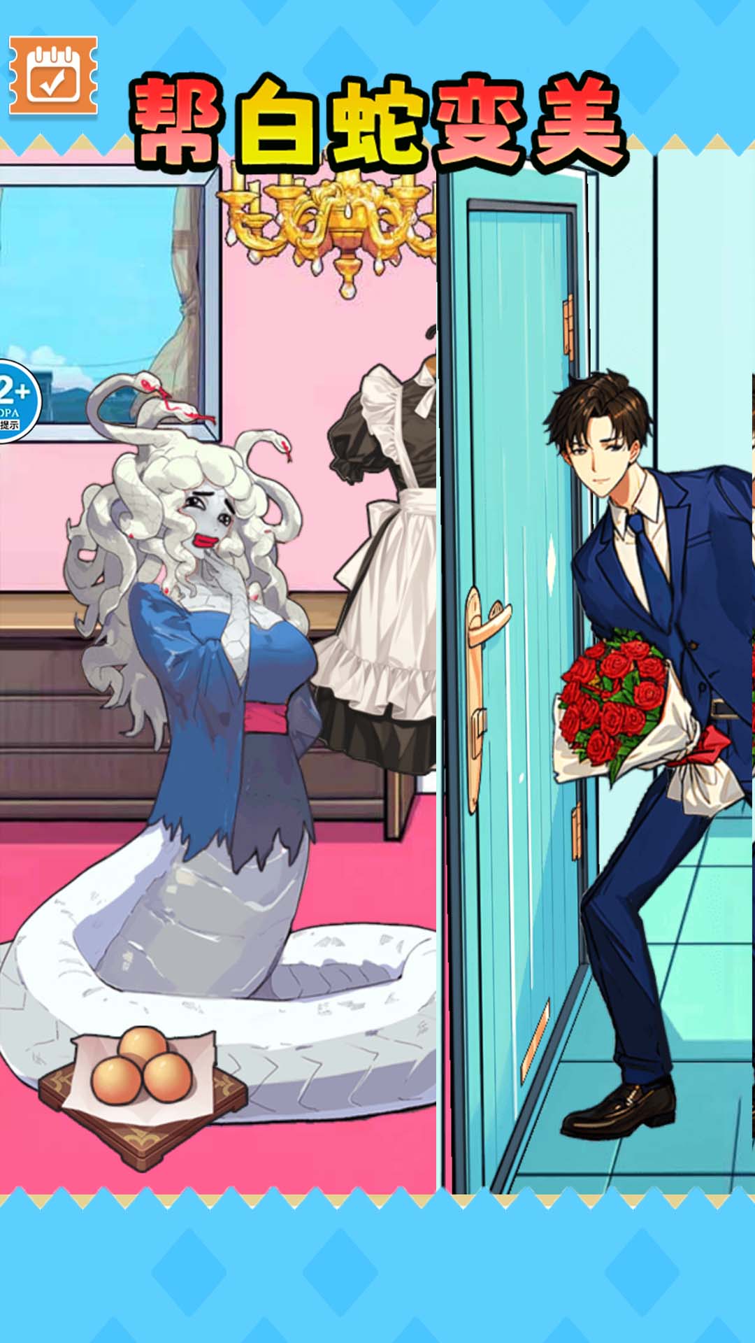 帮动物变美游戏是一款益智解谜装扮游戏,游戏玩法非常独特,游戏中我们要帮助小蛇女变美,顺利获得男友的芳心,有着多样化的装扮可以解锁,我们可以按照自己的审美要求进行搭配,给小蛇女打造出十分个性魅力的造型。