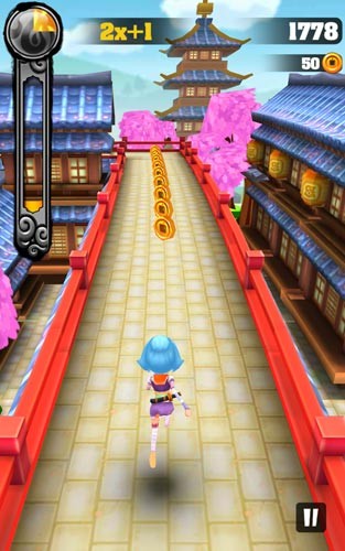 3、操控蓝发女孩在红色栏杆石桥奔跑,避开黑色武士障碍,收集灯笼和樱花,左上角能量条显示1x+0倍数。