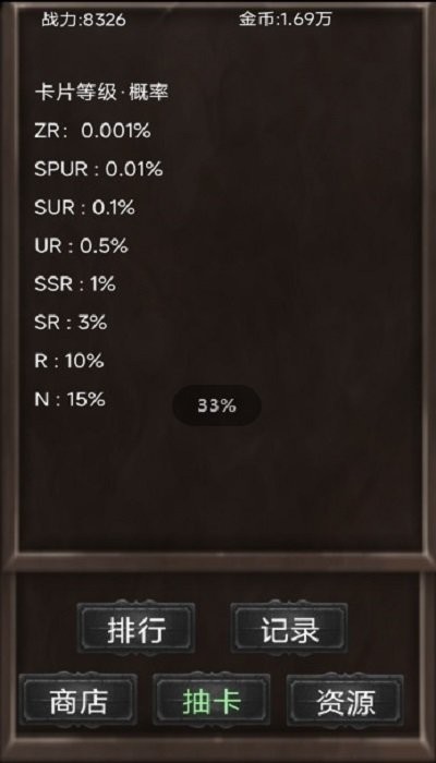 1、游戏主界面顶部显示战力,中间列出8种卡牌等级及概率,底部有5个功能按钮,离线收益显示。