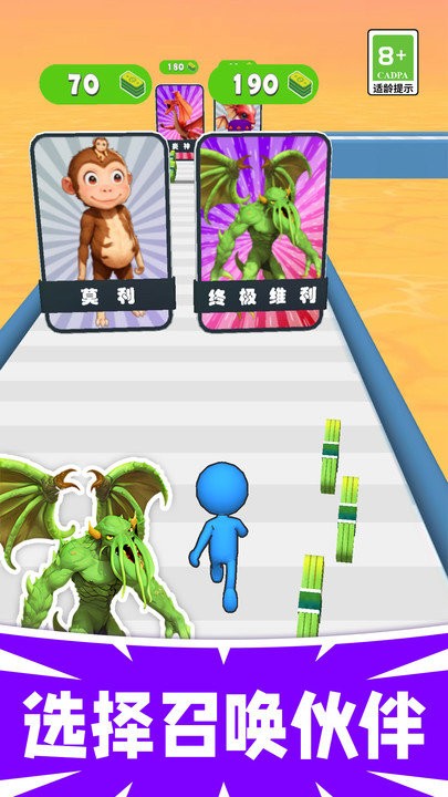 2、移动角色拾取沿途闪烁的钞票,积攒足够金额后前往商店解锁新怪兽伙伴。